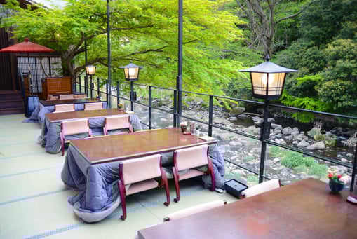 箱根の四季を体感できる当店の川床は、春夏は川風で涼を感じながら、